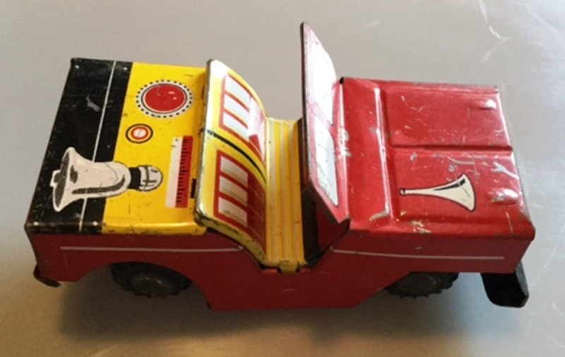 A Hungarian tinplate red toy representing a fire Chief car with driver