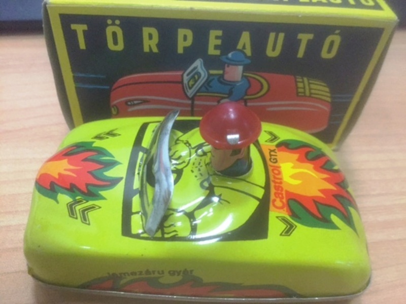 A Hungarian tinplate green toy representing a fire Chief car with driver