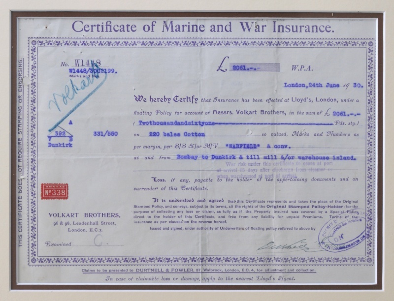 24.VOLKART BROTHERS CERTIFICATE OF MARINE AND WAR INSURANCE 1930