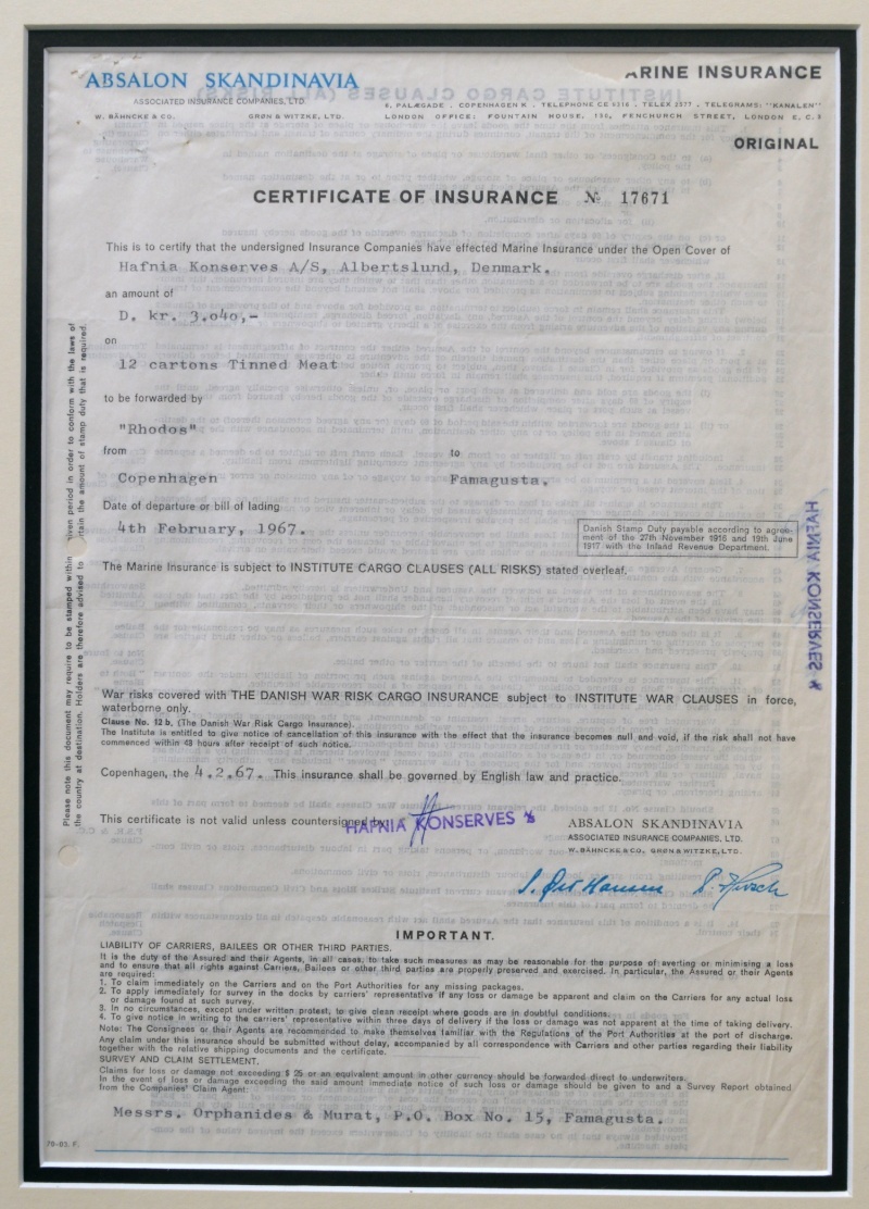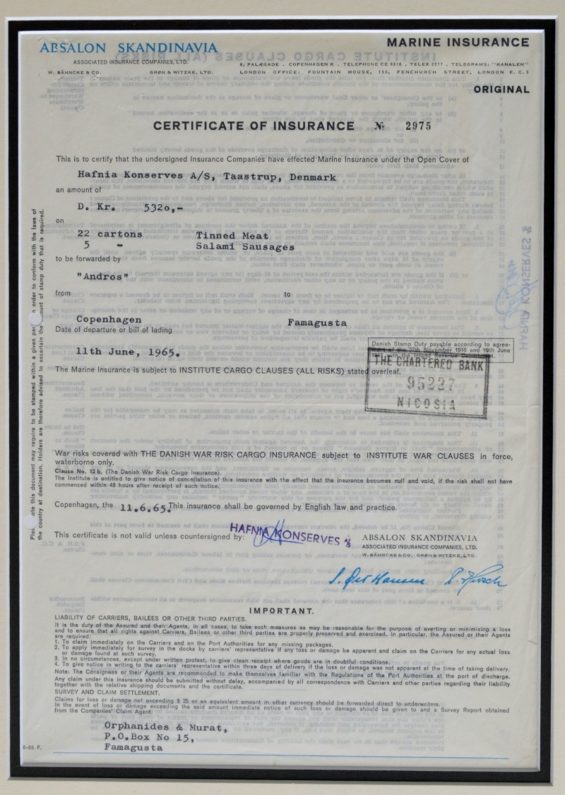 Tinned meat and Salami sausages insured from Copenhagen to Famagusta