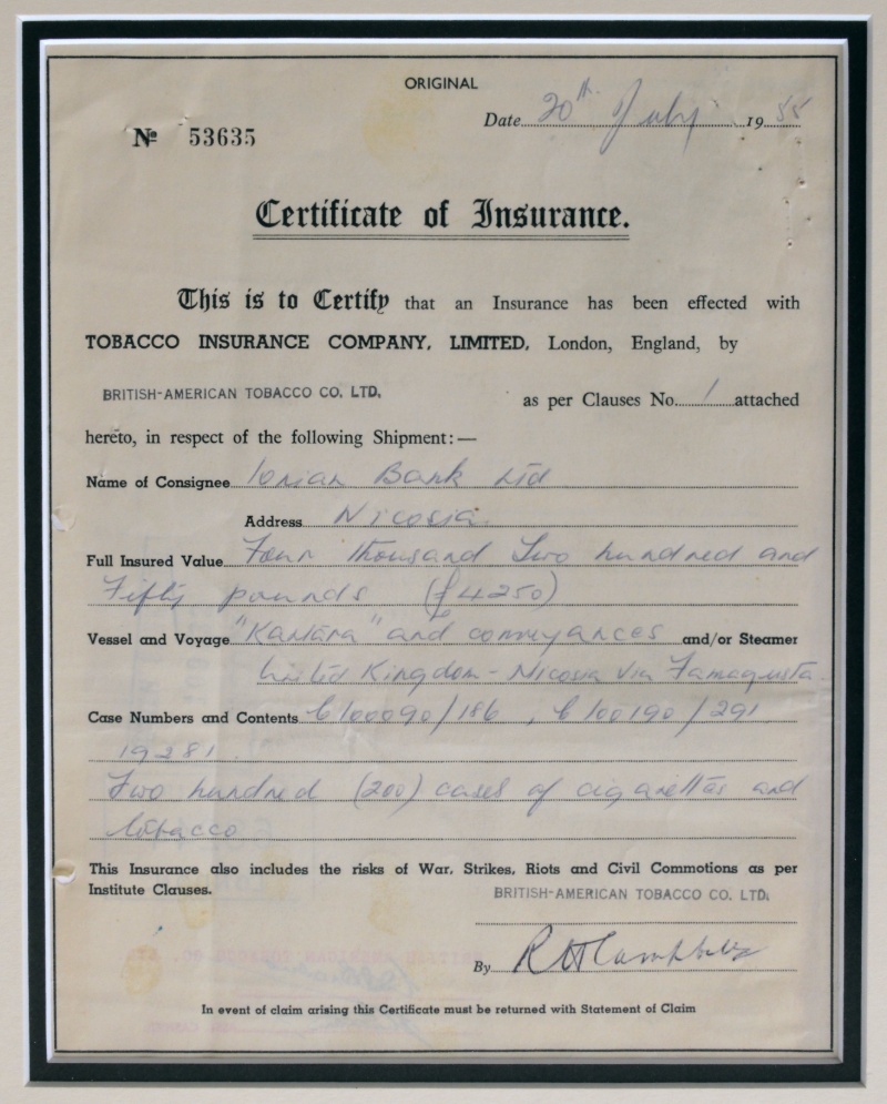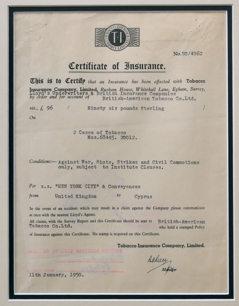 Two hundred cases of cigarettes and tobacco insured from United Kingdom to Famagusta