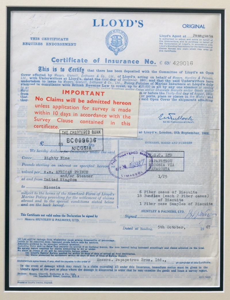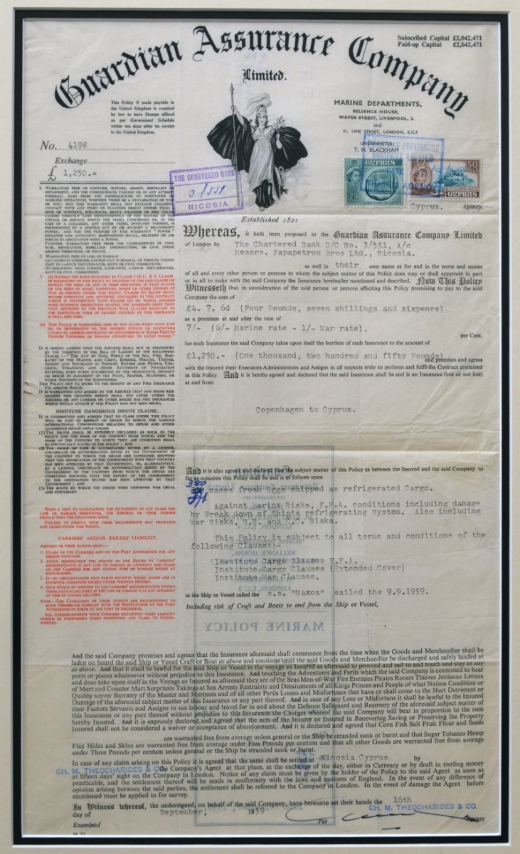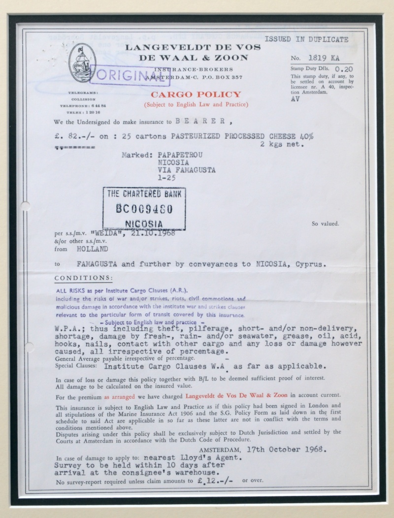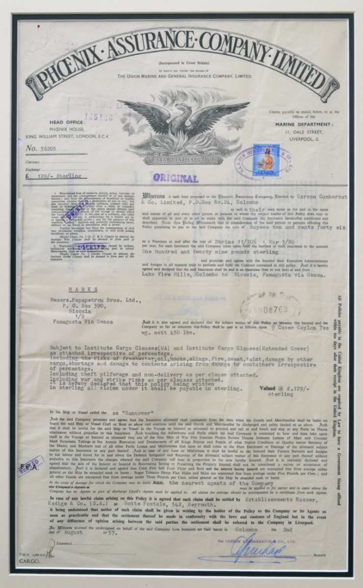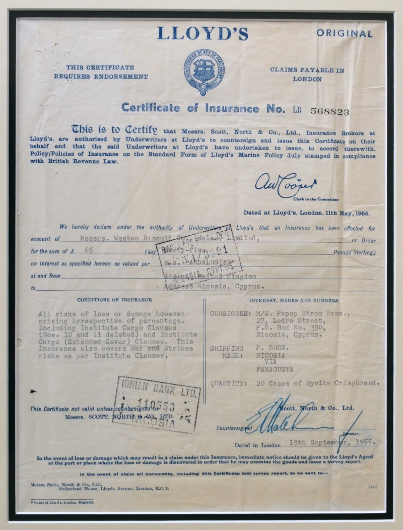Cereal products valued at UKP 130 insured from Glasgow to Nicosia via Famagusta