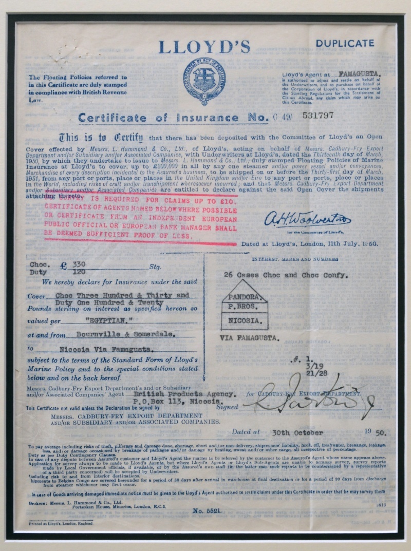 Twenty six cases choc and choc confy insured from Bournville & Somerdale to Nicosia via Famagusta