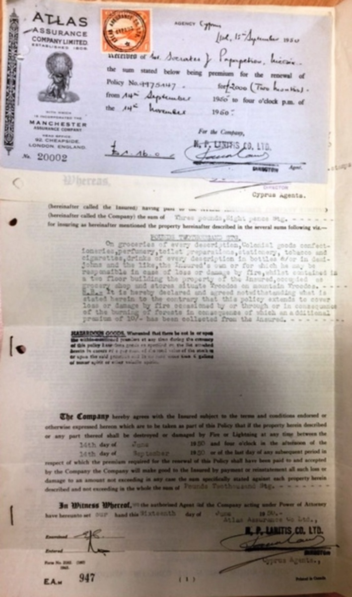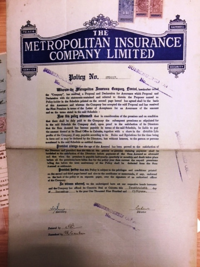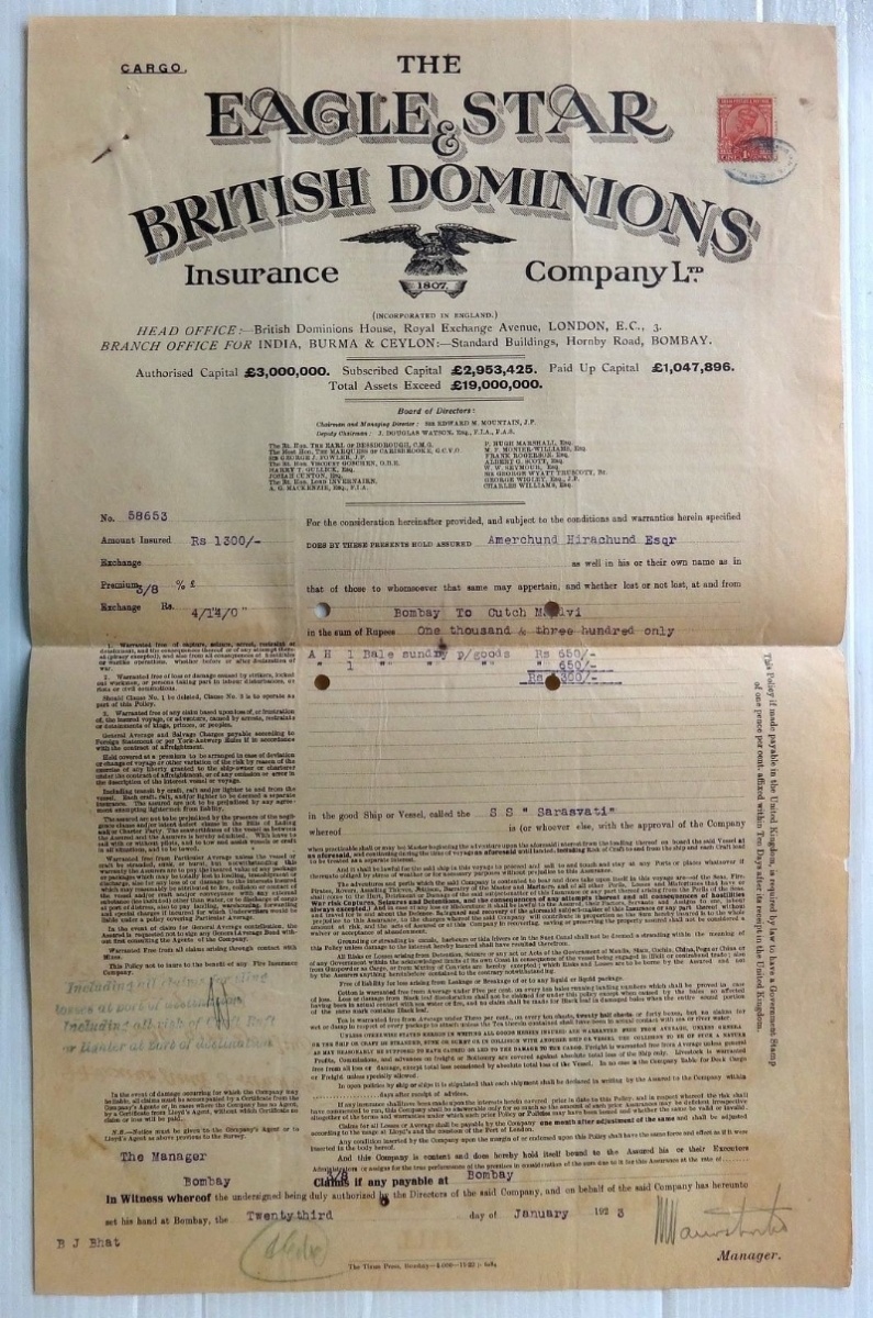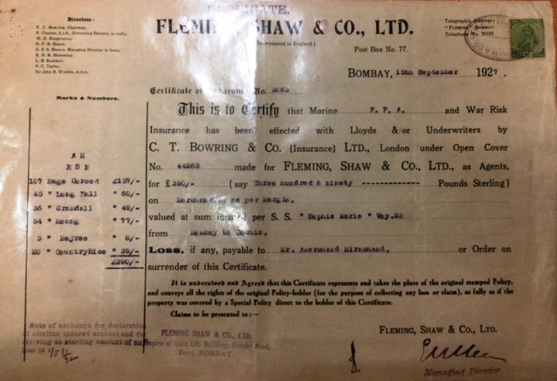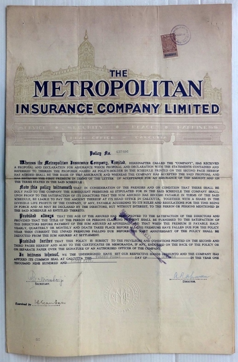 Insurance Policies, Receipts & Documents Posted at h in INSURANCE POLICIES & RECEIPTS by IICMuseum 0 Comments 0 Likes Share 304.THE NATIONAL MUTUAL LIFE ASSOCIATION OF AUSTRALASIA Receipt issued to M Borg 305.GREEN DELTA INSURANCE COMPANY LTD Subject matter: Aseptic packaging plant(recondition) for dairy 306.ADRIATICA SOCIETA ANONIMA DI NAVIGAZIONE Cargo shipped from Constantinople to Praga 311.SOUTHERN LIFE ASSOCIATION OF AFRICA Issued on behalf of Mr & Mrs G.P. Stofberg 313.THE NATIONAL INSURANCE COMPANY OF GREAT BRITAIN LIMITED-ΕΘΝΙΚΗ ΑΝΩΝΥΜΟΣ ΑΣΦΑΛΙΣΤΙΚΗ ΤΗΣ ΜΕΓΑΛΗΣ ΒΡΕΤΤΑΝΙΑΣ General agents Rallis & Plytas 315.FIRMA JAMES CATS Insured for 250 dry hides 316.THE SEA INSURANCE COMPANY LTD 317.Η ΙΟΝΙΚΗ ΑΝΩΝΥΜΟΣ ΕΤΑΙΡΕΙΑ ΓΕΝΙΚΩΝ ΑΣΦΑΛΕΙΩΝ Residents of Plaka Athens 318.ΑΣΤΗΡ ΑΝΩΝΥΜΟΣ ΑΣΦΑΛΙΣΤΙΚΗ ΕΤΑΙΡΙΑ One year policy coverage 319.ΑΛΛΑΙΑΝΣ ΑΓΓΛΙΚΗ ΑΣΦΑΛΙΣΤΙΚΗ ΕΤΑΙΡΙΑ ALLIANCE ASSURANCE COMPANY LIMITED One year policy coverage 320.Ο ΦΟΙΝΙΞ On behalf of Ms Keti Matiatou 321.ATLAS ASSURANCE COMPANY LIMITED Groceries insured on behalf of Mr Papapetrou 322.ROYAL INSURANCE COMPANY LIMITED Insured amount of seven thousand rupees 323.ROYAL INSURANCE COMPANY LIMITED Insured amount of twenty five thousand rupees 324.J.S.HOLT MOSELEY LIMITED Ten cases cotton yard 325.FLEMING SHAW CO LTD Insured amount of three hundred and ninety pounds sterling 331.THE EAGLE STAR BRITISH DOMINIONS One bale sundry p/goods 332.CALCUTTA INSURANCE LIMITED Lifetime of the assured 333.THE METROPOLITAN INSURANCE COMPANY LIMITED Life insurance for V.M.Rajkotia 334.THE STATE ASSURANCE COMPANY LIMITED Cargo insured 335.PEARL ASSURANCE COMPANY LIMITED Cargo insured 336.THE METROPOLITAN INSURANCE COMPANY LIMITED Life insurance for T. Meeraiah 337.THE METROPOLITAN INSURANCE COMPANY LIMITED Life insurance for B. B. Paul 338.THE STATE ASSURANCE COMPANY LIMITED Insurance for 26 clerical staff, 19 peons, 1 motor driver, 536 mechanists & laborers and 19 sub constructor’s laborers ◄1...6789►