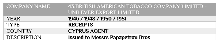 BRITISH AMERICAN TOBACCO COMPANY LIMITED – UNILEVER EXPORT LIMITED Posted at h in BRITISH AMERICAN TOBACCO COMPANY LIMITED - UNILEVER EXPORT LIMITED, CYPRUS, INSURANCE POLICIES & RECEIPTS by IICMuseum 0 Comments 0 Likes Share
