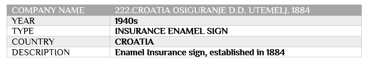 CROATIA OSIGURANJE D.D. UTEMELJ. 1884 Posted at h in CROATIA, CROATIA OSIGURANJE D.D. UTEMELJ. 1884, INSURANCE TIN SIGNS by IICMuseum 0 Comments 0 Likes Share 222. CROATIA OSIGURANJE D.D. UTEMELJ
