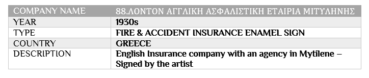 in GREECE, INSURANCE ENAMEL SIGNS, ΛΟΝΤΟΝ ΑΓΓΛΙΚΗ ΑΣΦΑΛΙΣΤΙΚΗ ΕΤΑΙΡΙΑ ΜΙΤΥΛΗΝΗΣ