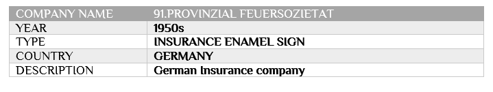 PROVINZIAL FEUERSOZIETAT Posted at h in GERMANY, INSURANCE ENAMEL SIGNS, PROVINZIAL FEUERSOZIETAT by IICMuseum 0 Comments 0 Likes Share 91. PROVINZIAL FEUERSOZIETAT