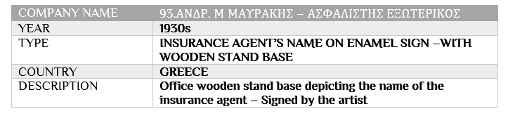 ΑΝΔΡ. Μ ΜΑΥΡΑΚΗΣ – ΑΣΦΑΛΙΣΤΗΣ ΕΞΩΤΕΡΙΚΟΣ Posted at h in GREECE, INSURANCE ENAMEL SIGNS, ΑΝΔΡ. Μ ΜΑΥΡΑΚΗΣ – ΑΣΦΑΛΙΣΤΗΣ ΕΞΩΤΕΡΙΚΟΣ by IICMuseum 0 Comments 0 Likes Share 93. ΑΝΔΡ. Μ ΜΑΥΡΑΚΗΣ ΑΣΦΑΛΙΣΤΗΣ ΕΞΩΤΕΡΙΚΟΣ