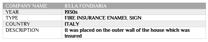 LA FONDIARIA Posted at h in INSURANCE ENAMEL SIGNS, ITALY, LA FONDIARIA by IICMuseum 0 Comments 0 Likes Share 83. LA FONDIARIA