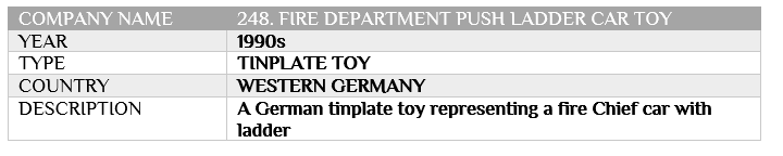 18 May FIRE DEPARTMENT PUSH LADDER CAR TOY Posted at 11:30h in Uncategorized by IICMuseum 0 Comments 0 Likes Share