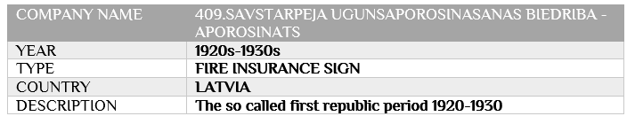 18 May SAVSTARPEJA UGUNSAPOROSINASANAS BIEDRIBA – APOROSINATS Posted at 09:06h in INSURANCE TIN SIGNS, LATVIA by IICMuseum 0 Comments 0 Likes Share